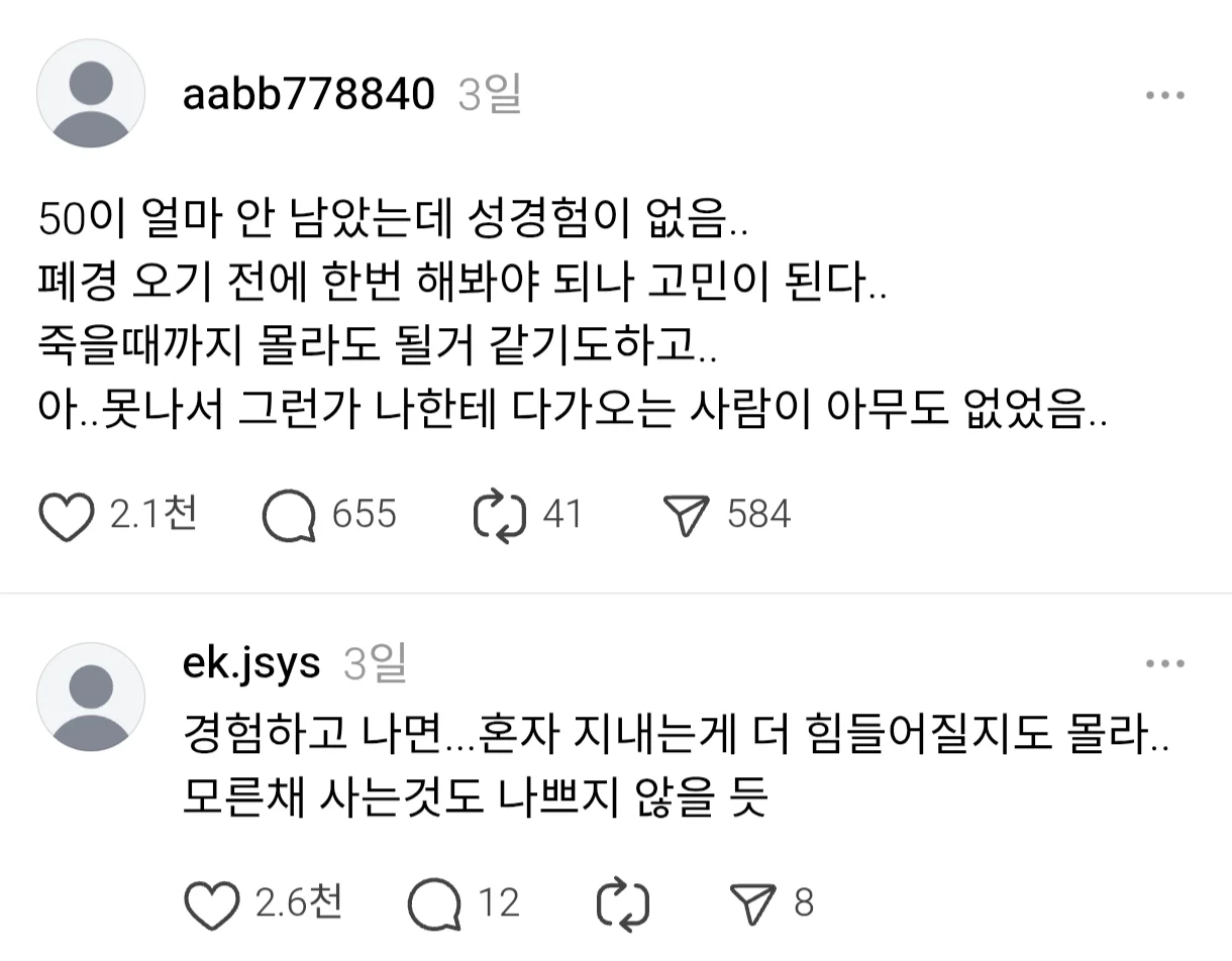 50이 얼마 안 남았는데 성경험이 없다는 쓰레드녀