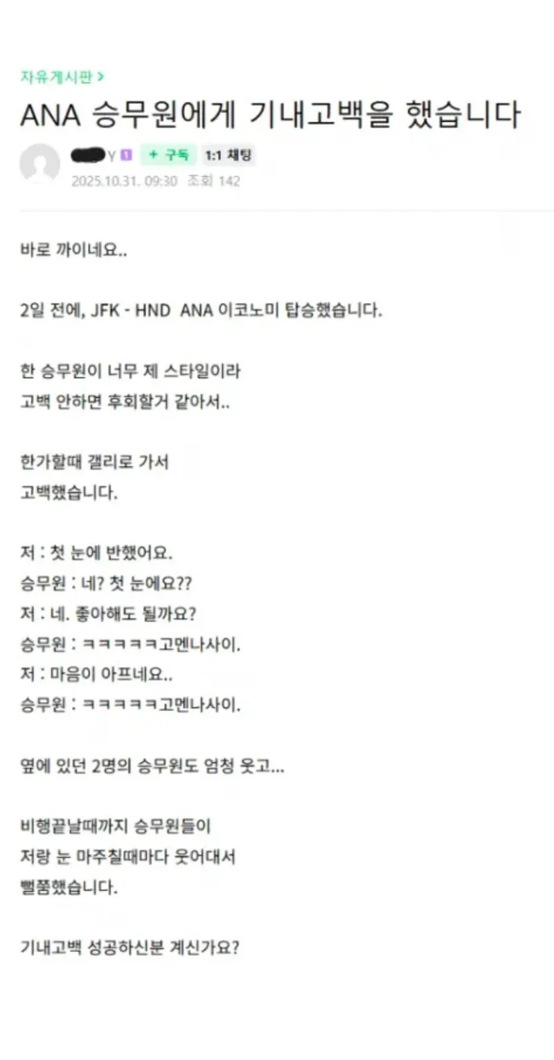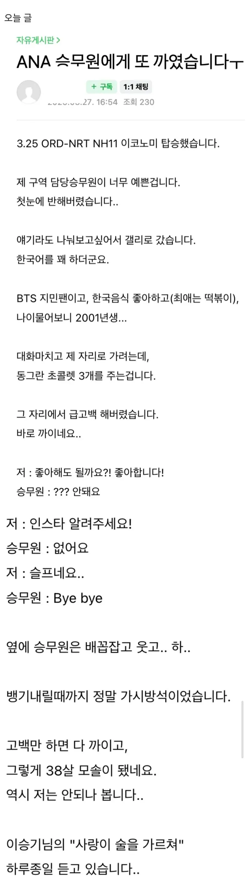 일본인 승무원에게 기내 고백 했습니다