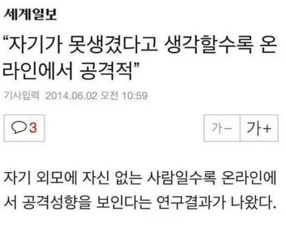 자기가 못 생겼다고 생각할수록 온라인에서 공격적