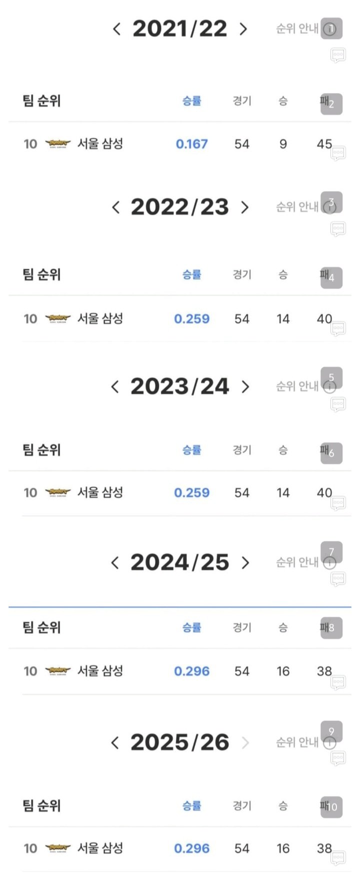 한국 프로 스포츠 최초 '5년 연속 꼴등' 탄생