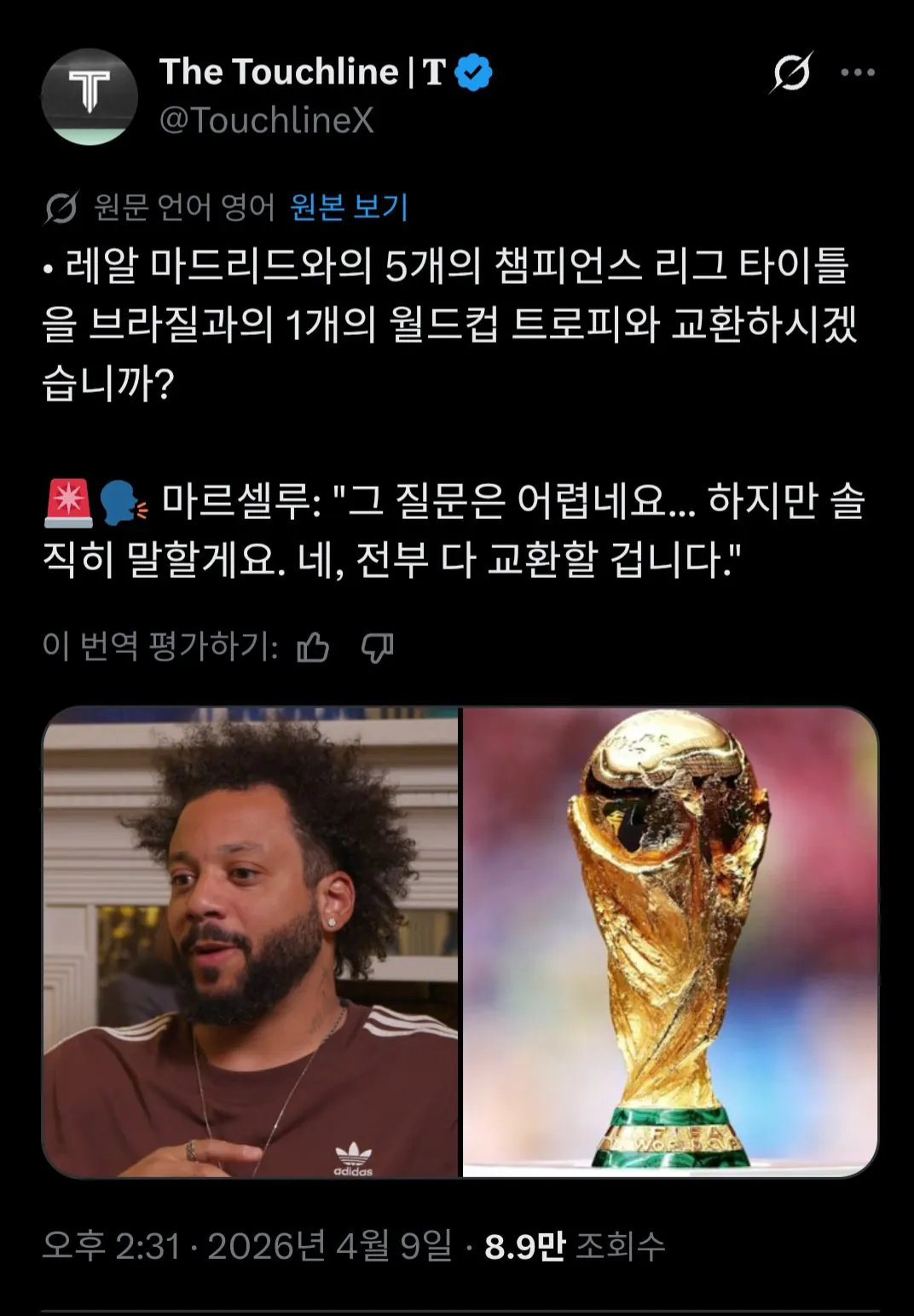 마르셀루: 챔스 5회 우승 vs 월드컵 1회 우승?
