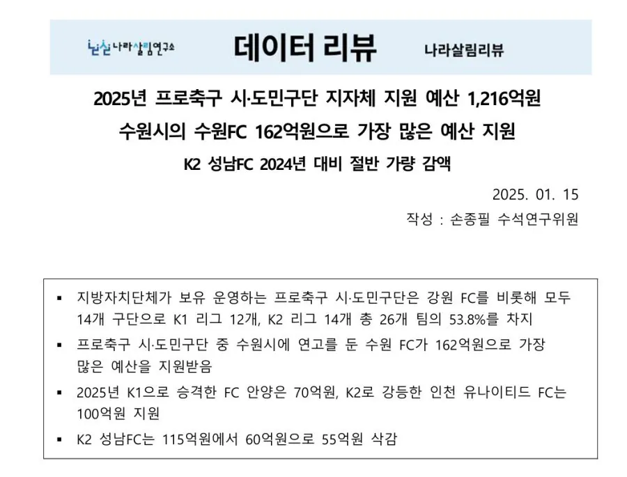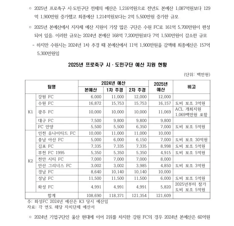 25년 축구 시민구단에 들어간 세금 1216억
